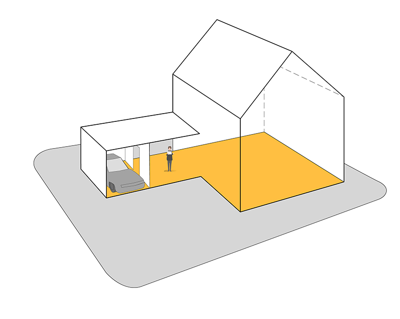§ 5-2 figur 2: Åpent overbygd areal. Kommunikasjonsvei, for eksempel et åpent overbygd areal mellom garasje og bolig, skal medregnes i bebygd areal. (Klikk for større bilde.)